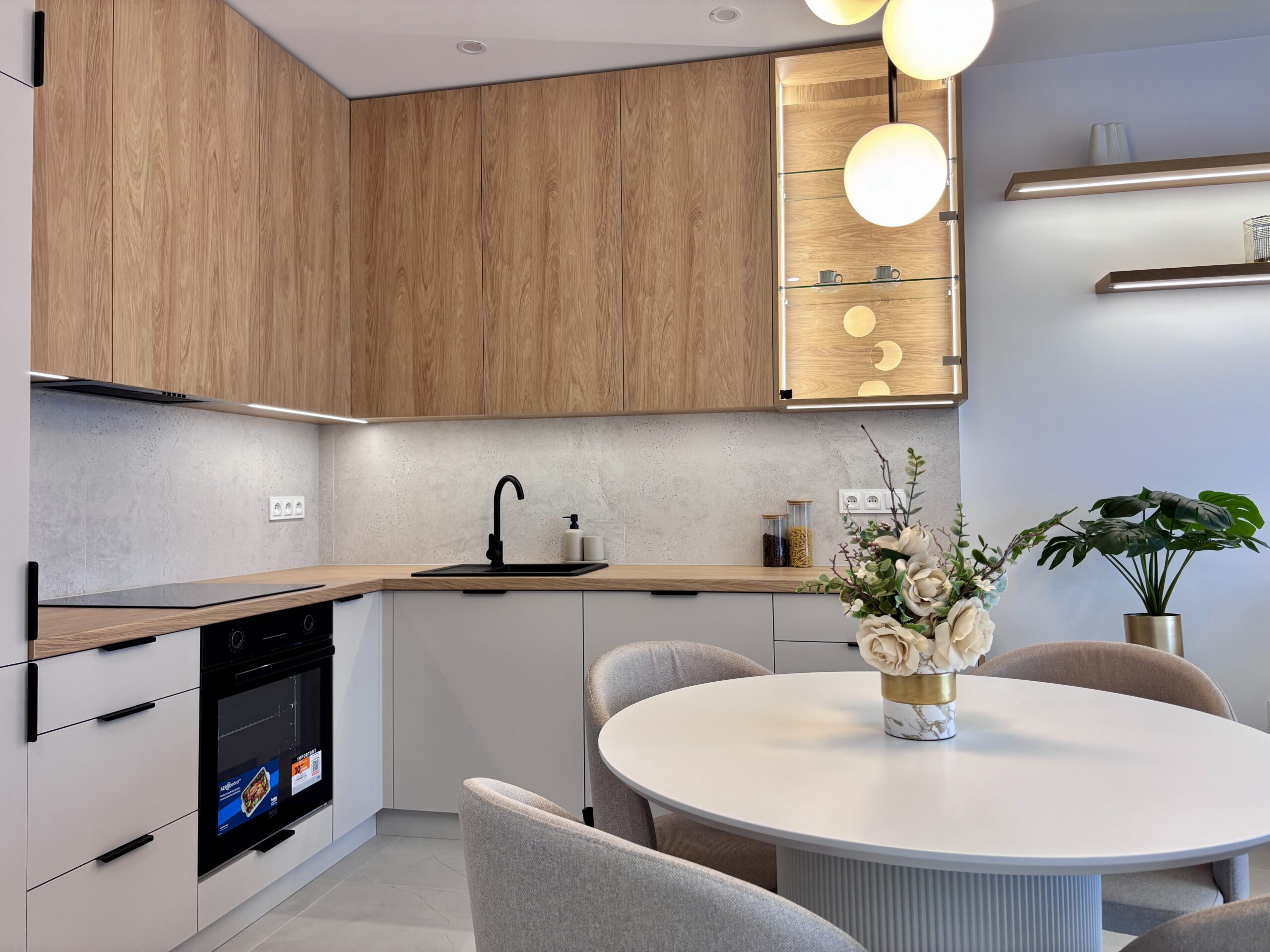 Kuchnia została wykonana na wymiar przez stolarza, z dbałością o każdy detal. Dominują w niej ciepłe, naturalne kolory, które wpisują się w aktualne trendy. Znajduje się tu: