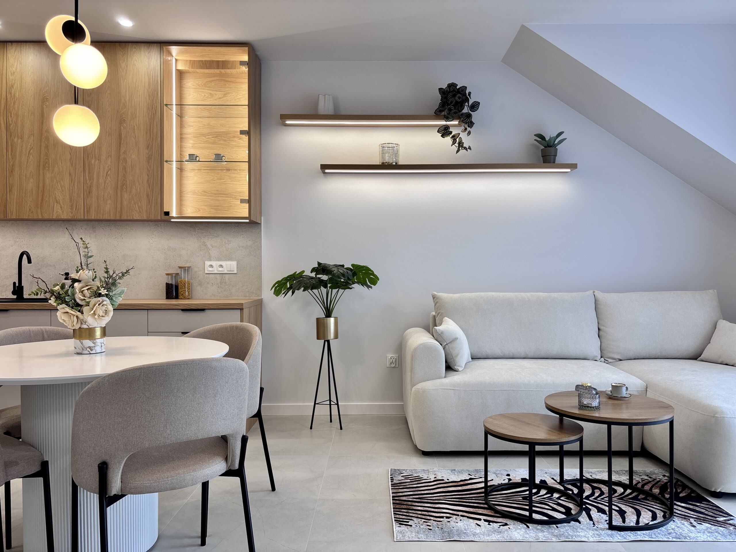 • Duży stół jadalniany oddzielający strefę kuchenną od wypoczynkowej.