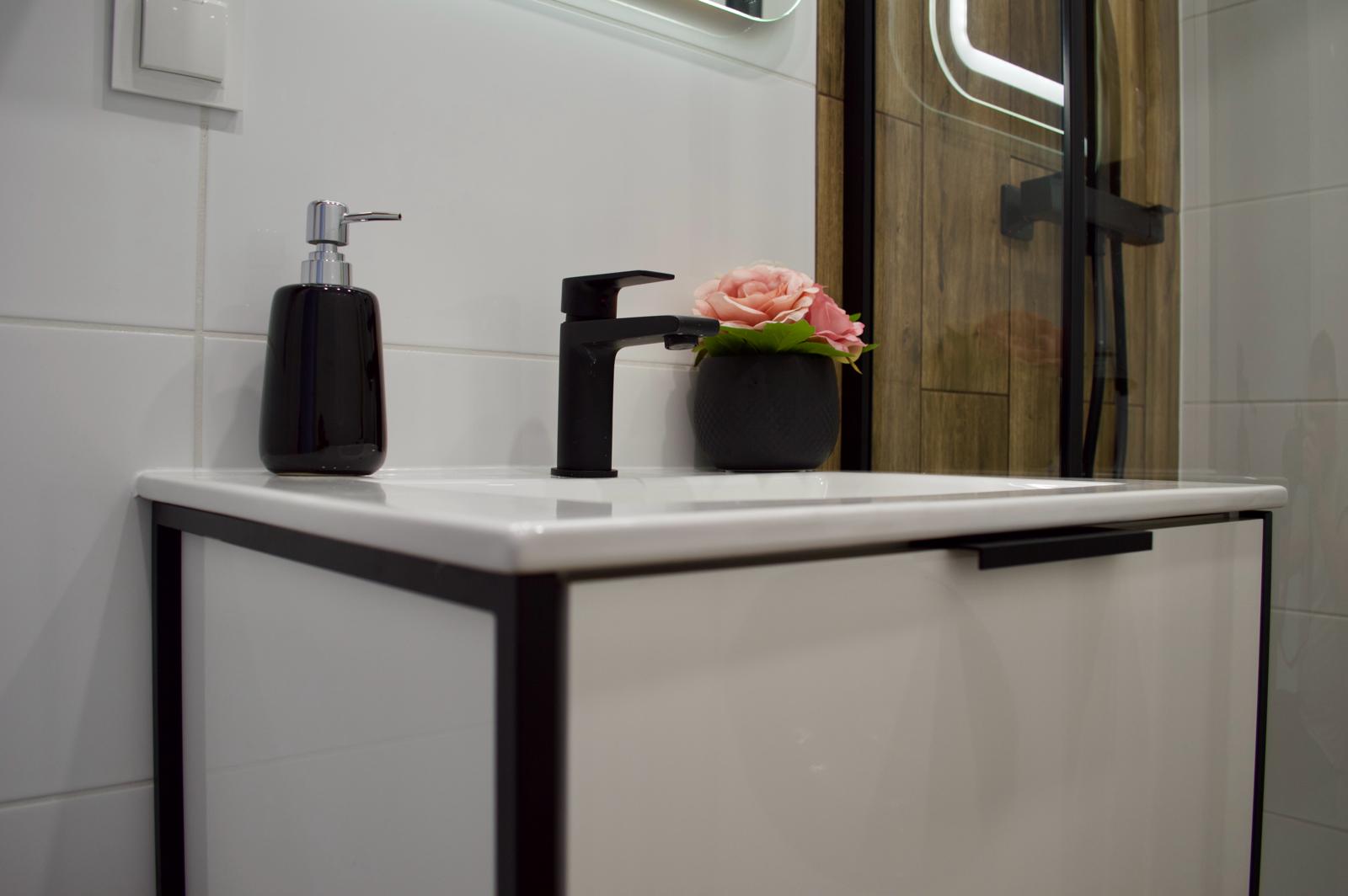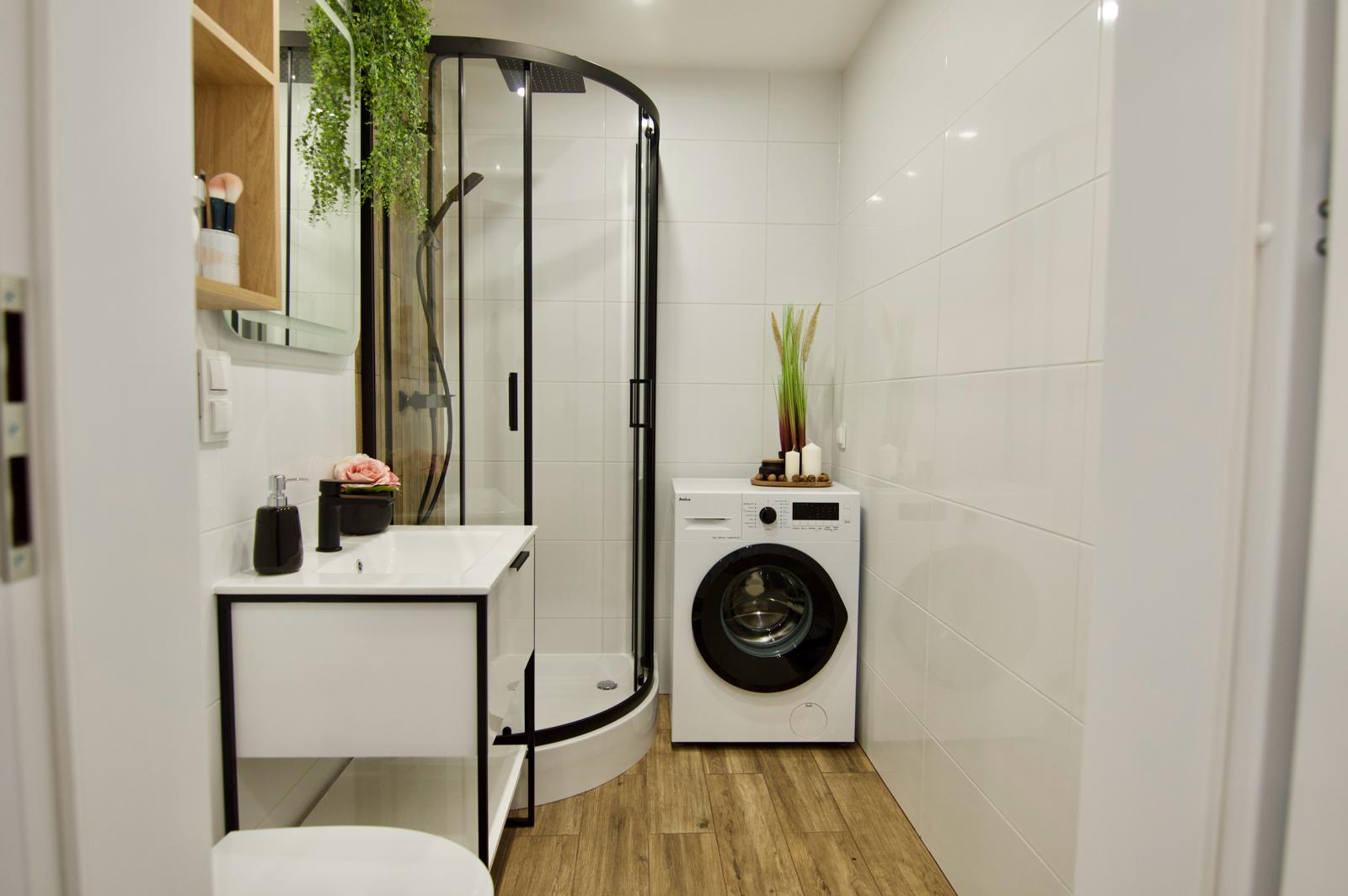 Duży salon z wygodnym rozkładanym narożnikiem stanowi idealne miejsce do wypoczynku, a dwie ustawne sypialnie zapewniają prywatność i spokój. Łazienka, z eleganckimi białymi płytkami i ciemnymi akcentami, wyposażona w pralkę, kabinę prysznicową z deszczownicą, umywalkę z szafką oraz nadtynkowe WC, stanowi przykład nowoczesnej elegancji. Dzięki termomodernizacji bloku, mieszkanie cieszy się niskimi kosztami utrzymania, a miejskie ogrzewanie i ciepła woda zapewniają komfort użytkowania przez cały rok